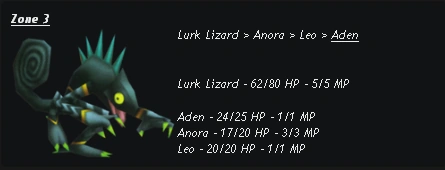 - At the very top of the screen, the battle order is displayed. This order is referred to as a Cycle. Each cycle is determined by the speed stat. The current player's turn is underlined, while fainted players have their names crossed.